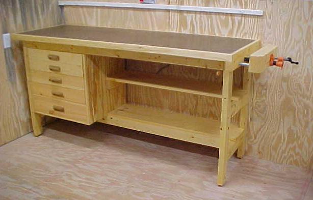 After having a 12' x 16' shed built for a workshop, I needed a work bench. I designed and built this out of Pine. The table top is 2 pieces of 3/4" plywood and a 1/4" hardboard sandwich with a 1-3/4" x 1-1/2" tongue and grooved frame around the outside The wood vise is made out of a pipe clamp.