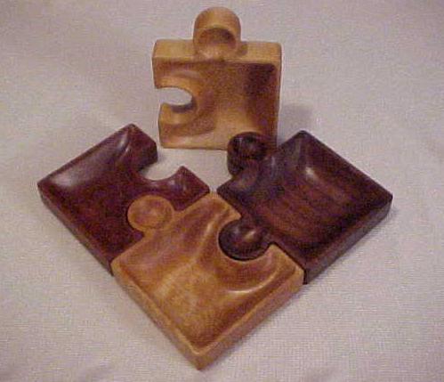Project 1: A set of hand carved items. I made a set of snack dishes that interlocked like a jigsaw puzzle. Four different types of wood were used, Cherry, Walnut, Flame Birch and Maple.